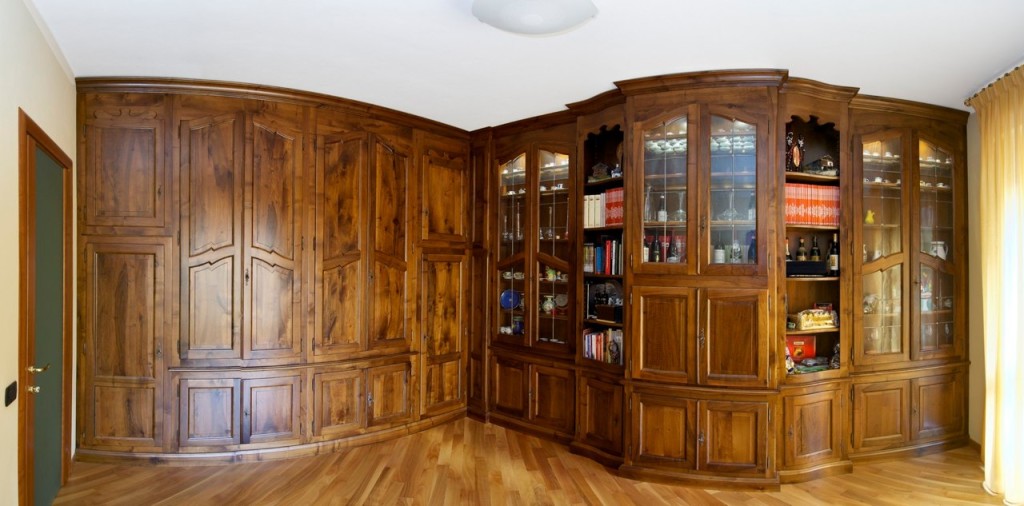 Arredamento in noce nazionale composto da guardaroba, cristalleria e libreria.
